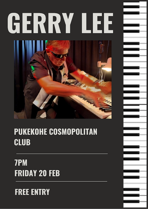 We are thrilled to welcome the legendary Gerry Lee to the Pukekohe Cosmopolitan Club for an unforgettable night of live music.